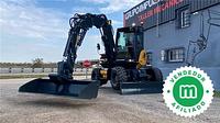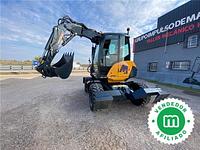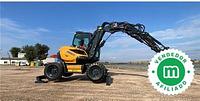 Excavadora de ruedas Mecalac modelo 9MWR, máquina muy versátil: excava, carga, transporta, homologada cómo grúa. Máquina matriculada, año 2020, 5.461 horas, motor diesel Deutz, 4 cilindros 75 cv, equipada con pala, cuatro cazos y pinzas porta-palets.