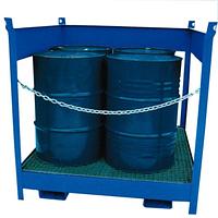 Este modelo puede almacenar hasta cuatro tambores de 220 litros, facilitando la retención y manejo de líquidos peligrosos. Su robusta construcción en acero garantiza durabilidad y resistencia contra diversos agentes químicos.